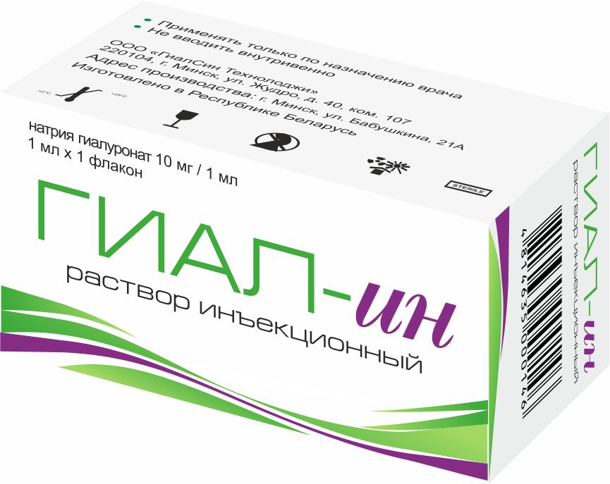 «ГИАЛ-ИН»/«HYAL-IN» является прозрачной вязкой бесцветной жидкостью, применяется в качестве стерильного раствора для парентерального (внутрисуставного, периартикулярного, подкожного и подслизистого) введения. Натрия гиалуронат (Na гиалуронат) - натриевая соль гиалуроновой кислоты (далее – ГК), полисахарида, присутствующего во всех тканях организма, в частности, в высокой концентрации в синовиальной жидкости, внеклеточном матриксе синовиальных оболочек, структурах глаза, других связочных, соединительно-тканных структурах и слизистых оболочках организма. Действующее вещество получено путем бактериальной ферментации, принадлежит к группе веществ, идентичных для всех живых организмов. Молекулярный вес используемой гиалуроновой кислоты 500-700 кДа.