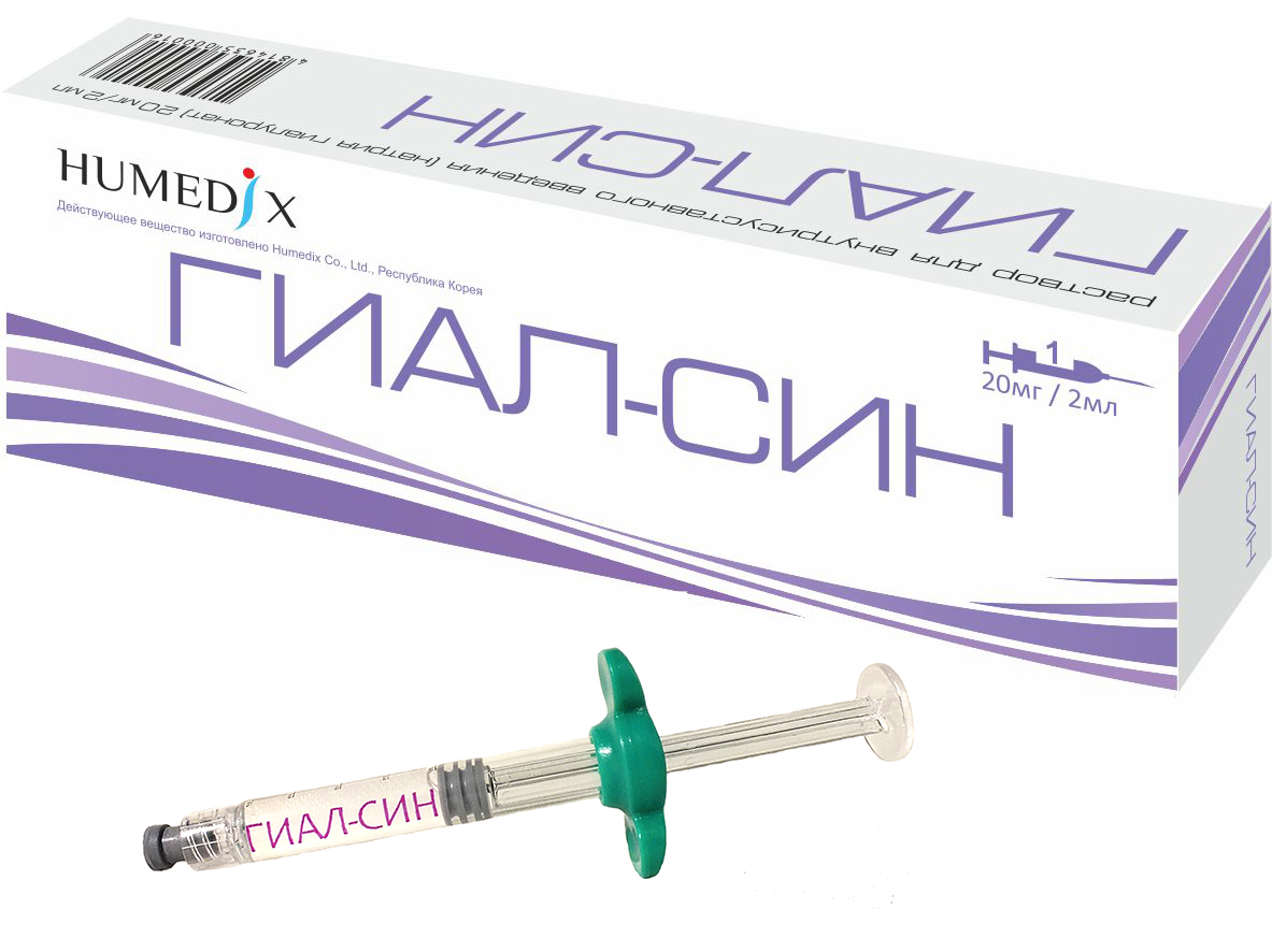 «ГИАЛ-СИН» является прозрачной бесцветной жидкостью, применяется в качестве стерильного вязкоэластичного имплантата для внутрисуставного введения в синовиальное пространство у пациентов, страдающих остеоартрозом. Действующее вещество получено методом бактериальной ферментации, принадлежит к группе веществ, идентичных для всех живых организмов. Расфасован в шприцы однократного применения. Молекулярный вес используемой гиалуроновой кислоты 2500-3000 кДа.Как оформить заказ